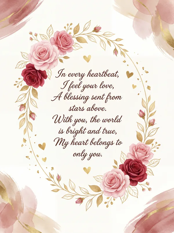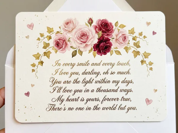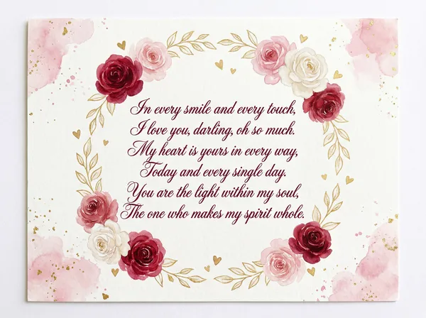 To the one who holds my heart so tight, You make my world so warm and bright. With every smile and every touch, I love you, darling, very much.