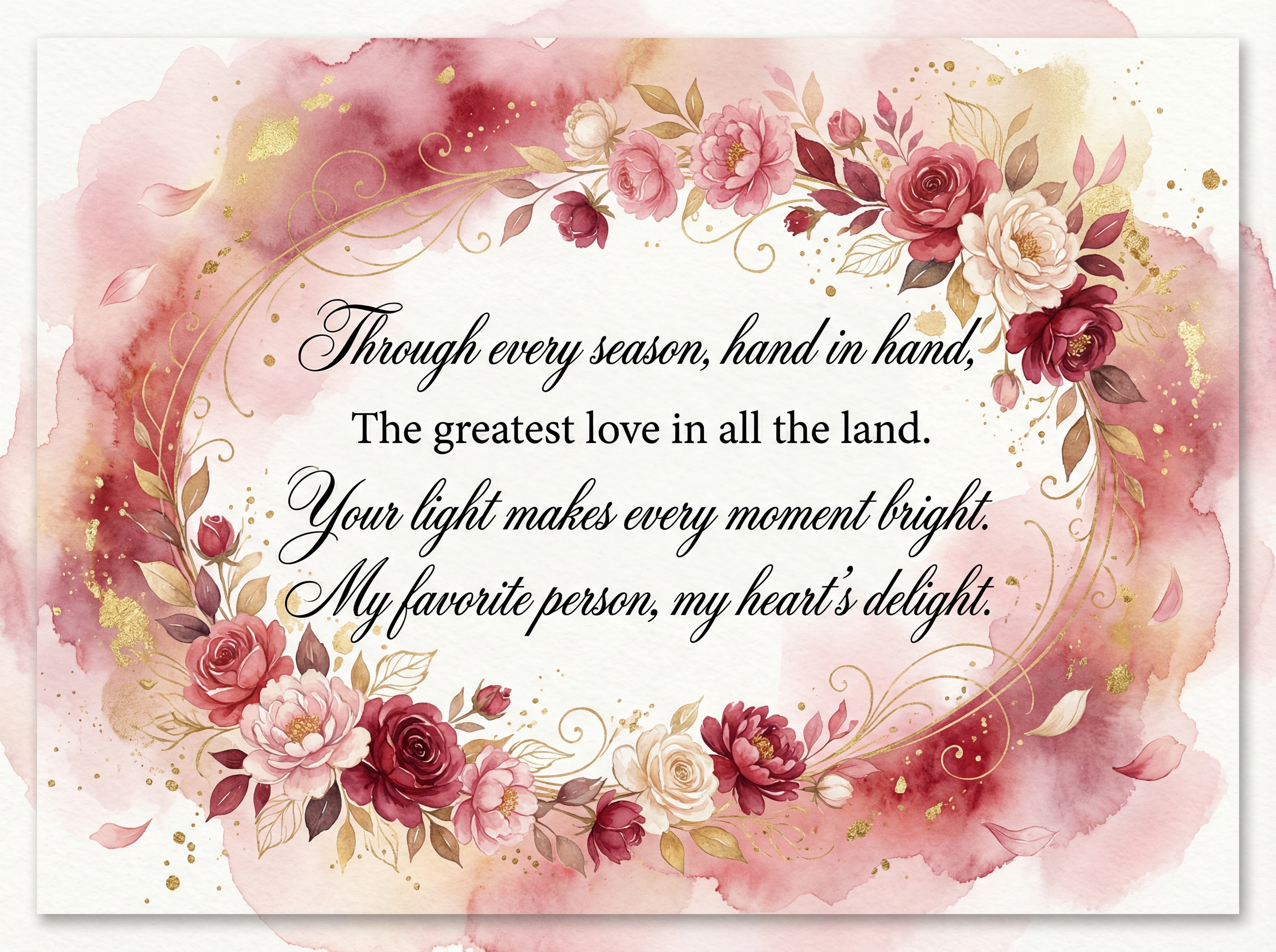 Through every season, hand in hand, The greatest love in all the land. Your light makes every moment bright, My favorite person, my heart's delight.