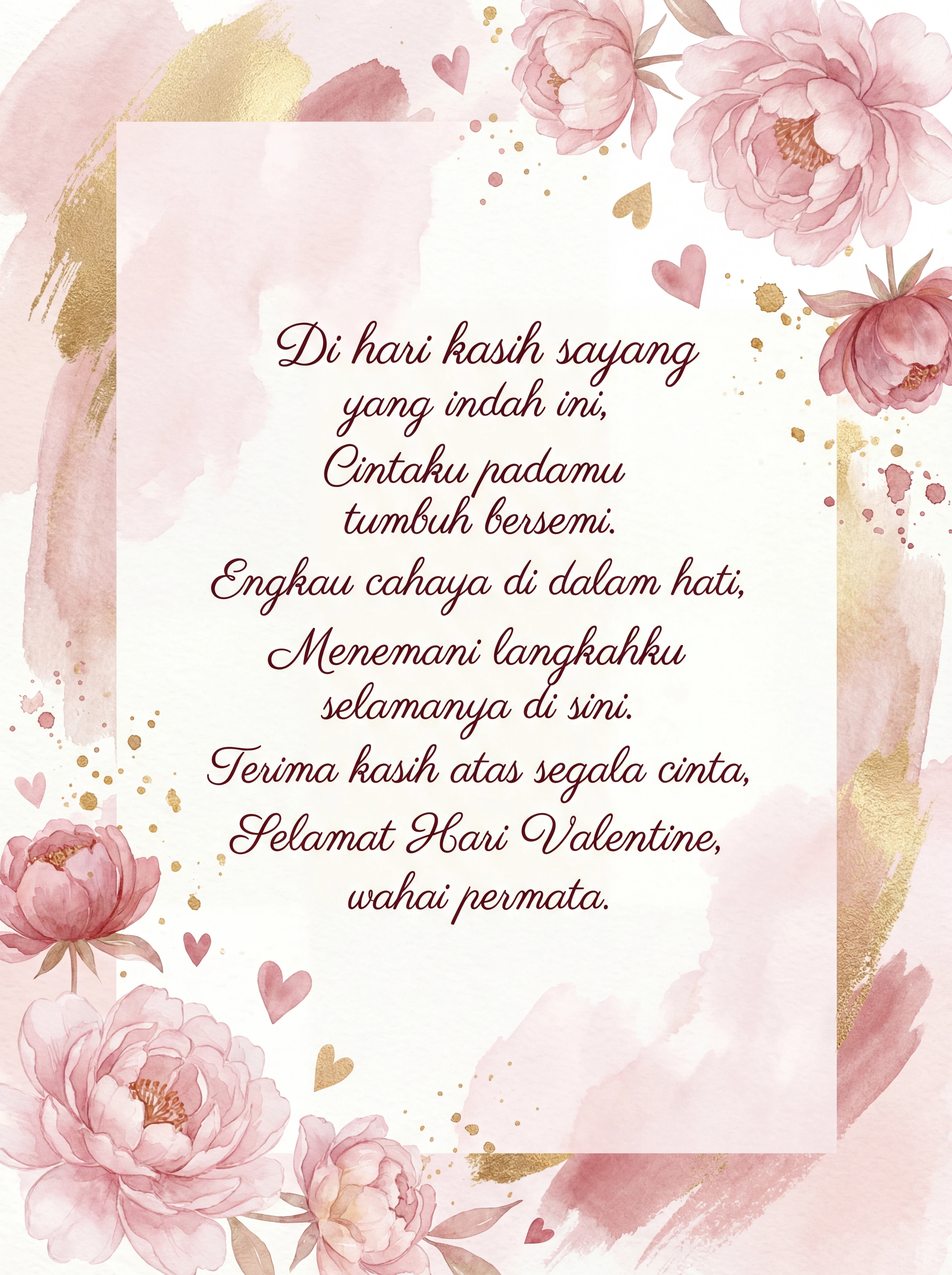 Di hari kasih sayang yang indah ini, Cintaku padamu tumbuh bersemi. Engkau cahaya di dalam hati, Menemani langkahku selamanya di sini. Terima kasih atas segala cinta, Selamat Hari Valentine, wahai permata.