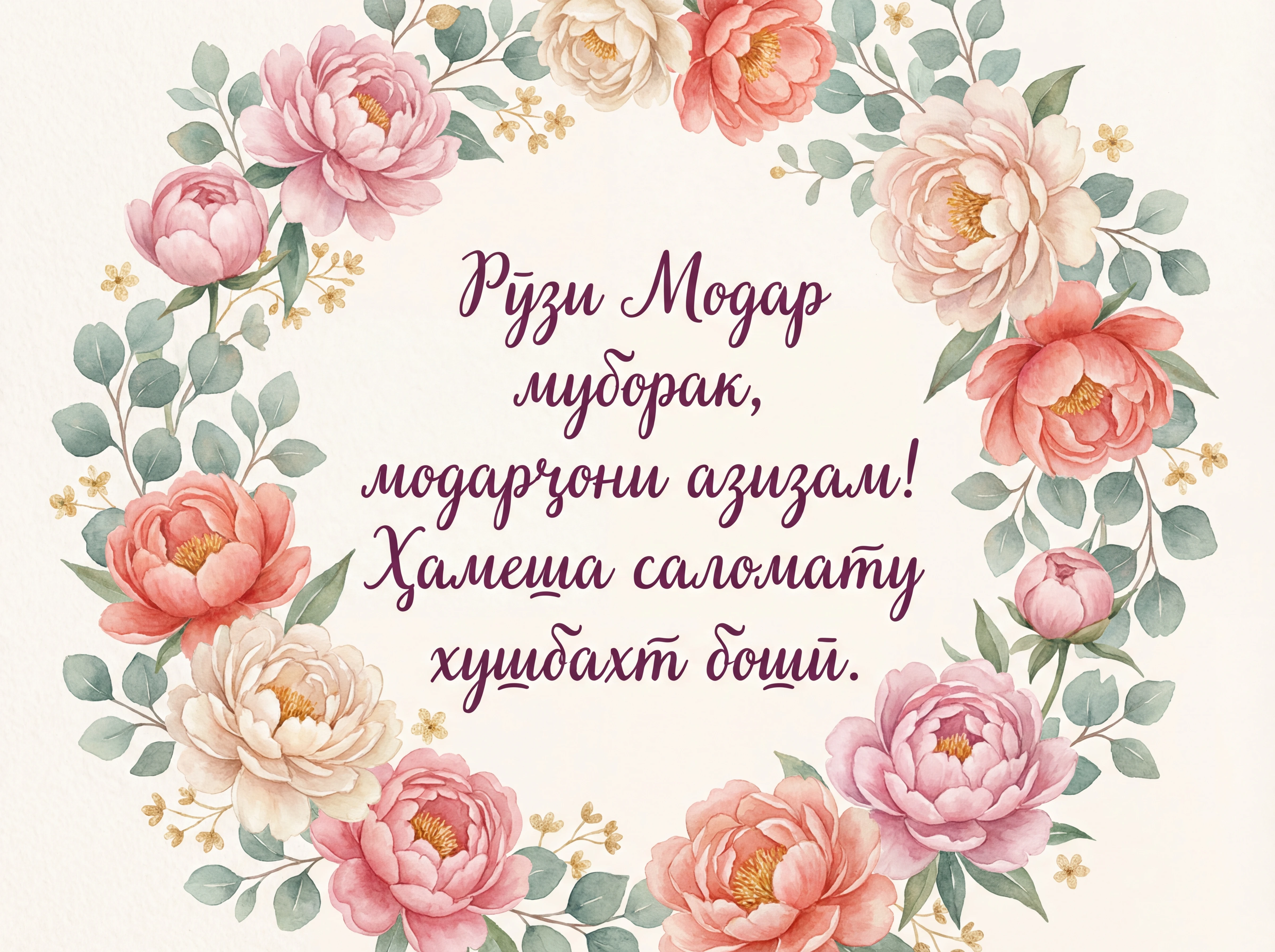 Рӯзи Модар муборак, модарҷони азизам! Ҳамеша саломату хушбахт бошӣ.