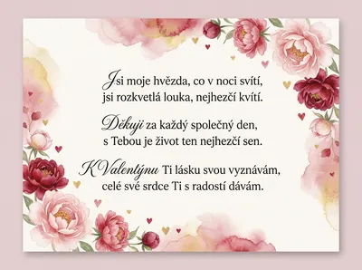 Láska je hvězda, co v noci září, úsměv, co rozjasní každou tvář. Děkuji ti za každý společný den, jsi můj splněný, nejkrásnější sen. K Valentýnu ti srdce své dávám, s tebou se nejraději probouzím i vstávám.