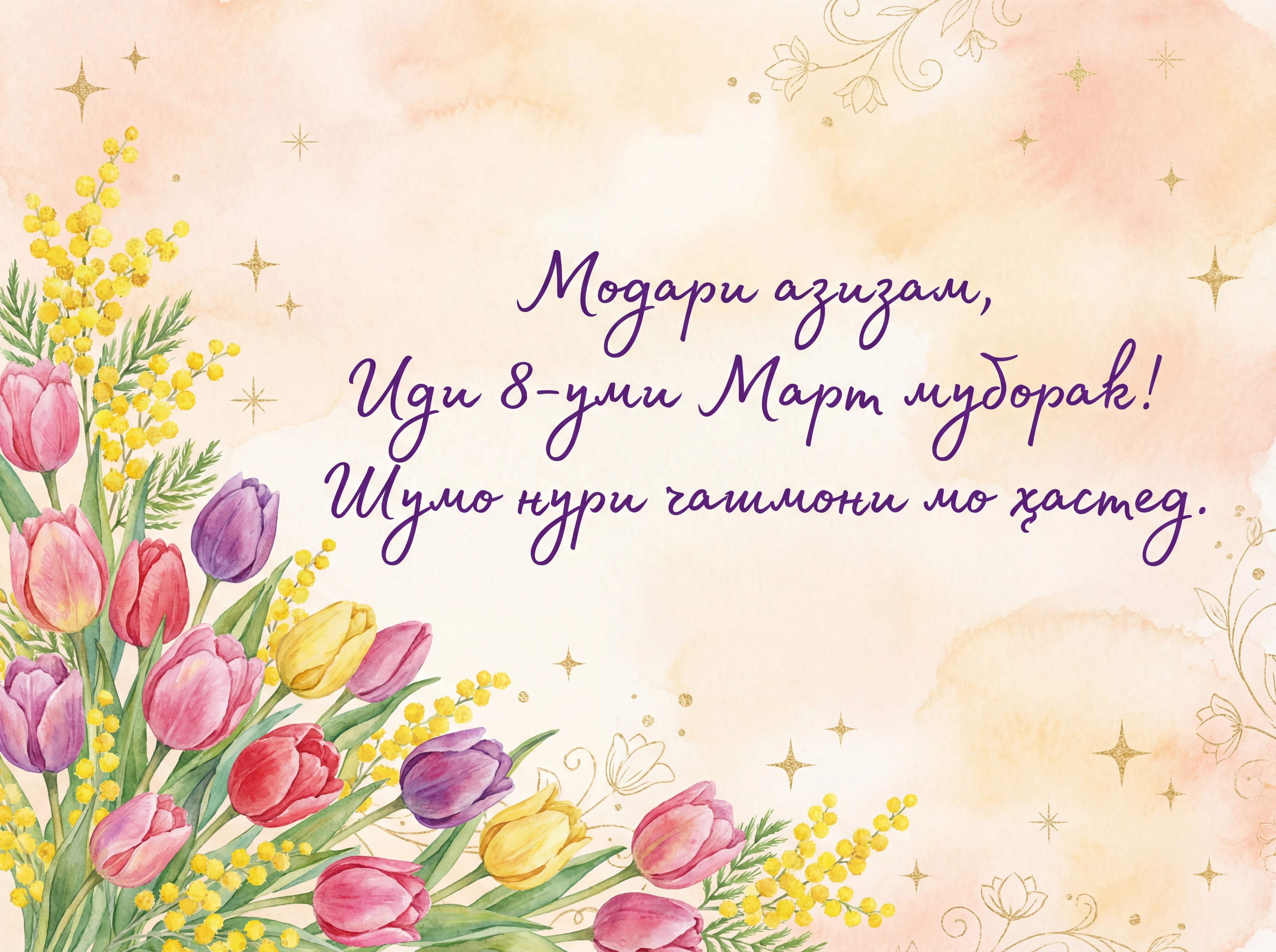 Модари азизам, Иди 8-уми Март муборак! Шумо нури чашмони мо ҳастед.