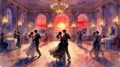 – Obrazy przedstawiające romantyczne sceny w sali balowej, często z tańcami lub eleganckimi interakcjami.