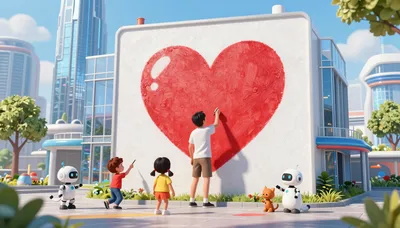 – Artystyczne przedstawienia chłopca i robota, ukazujące przyjaźń i przyszłość.