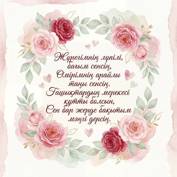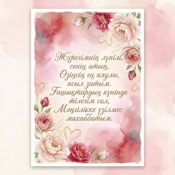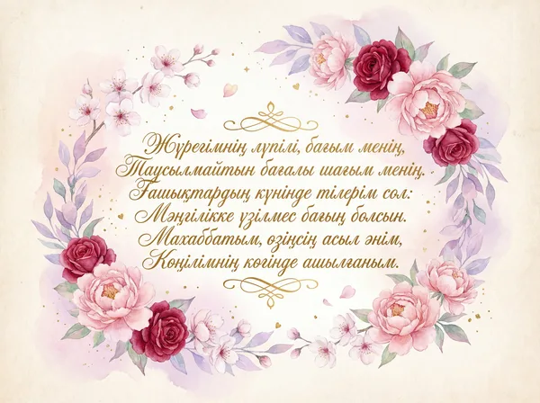 Жүрегімнің лүпілі, сенсің бағым, Сенсің менің арайлы, атқан таңым. Ғашықтардың күнінде тілерім сол – Бірге болсын мәңгілік бақ-талайым. Махаббатым өзіңсің, асыл жарым, Сенсің менің өмірлік асқақ әнім.