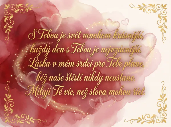 V mých očích jsi ten největší dar, naše láska je ten nejhezčí pár. Děkuji za každý společný den, jsi můj splněný, nejkrásnější sen. K Valentýnu Ti s láskou přeji, ať se naše srdce navždy hřejí.
