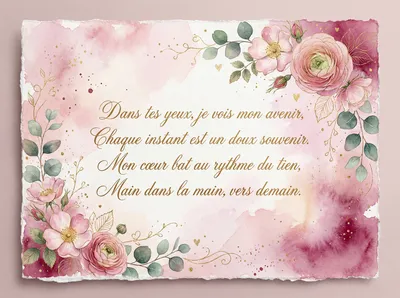Dans tes yeux, je vois mon avenir, Un doux parfum de joie et de soupirs. Mon cœur bat plus fort à chaque instant, À tes côtés, tout devient éclatant. Joyeuse Saint-Valentin, mon amour.