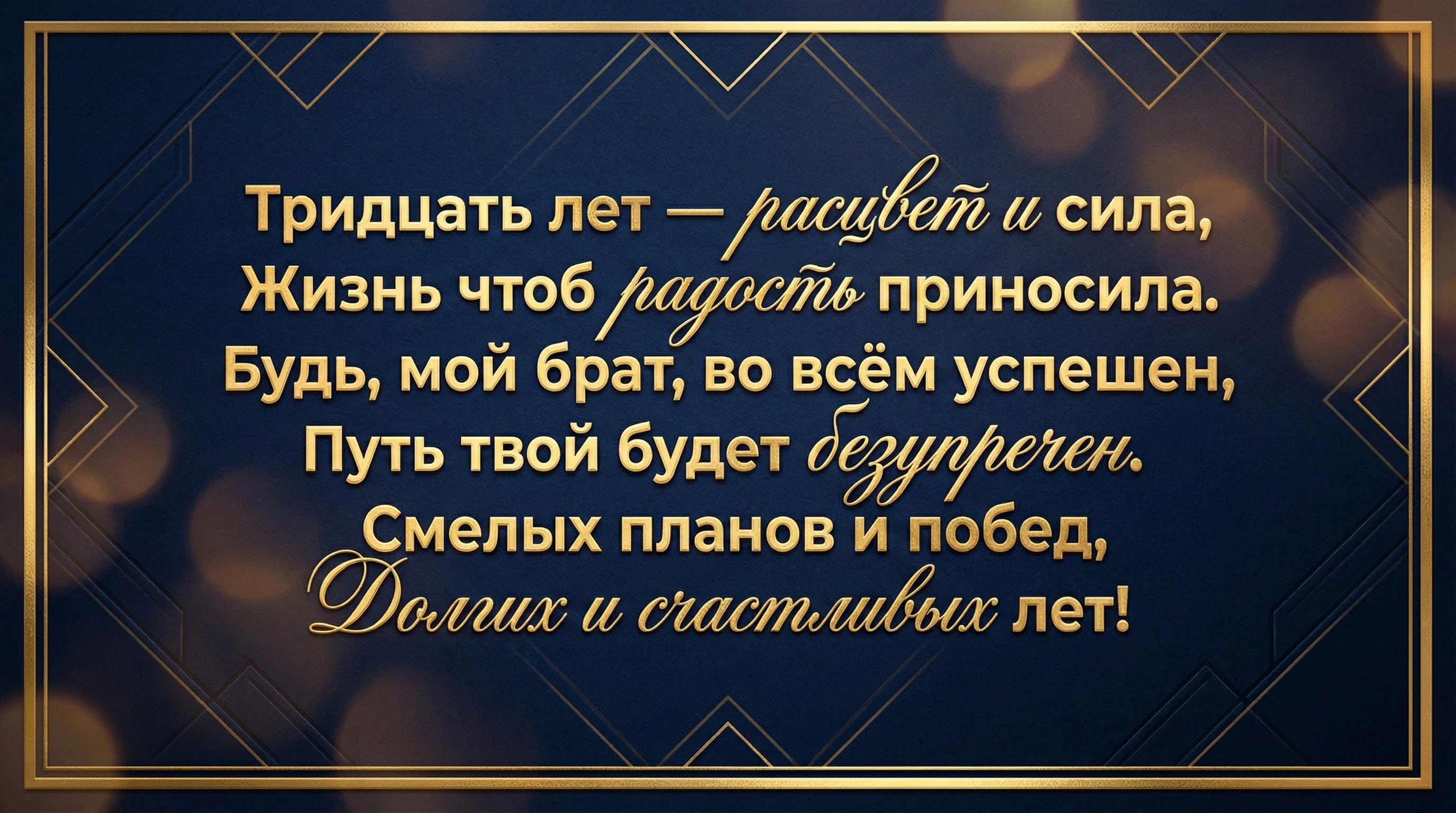 Тридцать лет — расцвет и сила, Жизнь чтоб радость приносила. Будь, мой брат, во всём успешен, Путь твой будет безупречен. Смелых планов и побед, Долгих и счастливых лет!