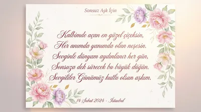 Seninle her anım bahar çiçeği, Gözlerin ömrümün en güzel rengi. Kalbimin atışı, ruhumun eşi, Seninle buldum ben gerçek sevgiyi. Sevgililer Günümüz Kutlu Olsun.