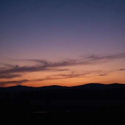 – O contorno dos edifícios de uma cidade contra o céu colorido durante o pôr do sol.