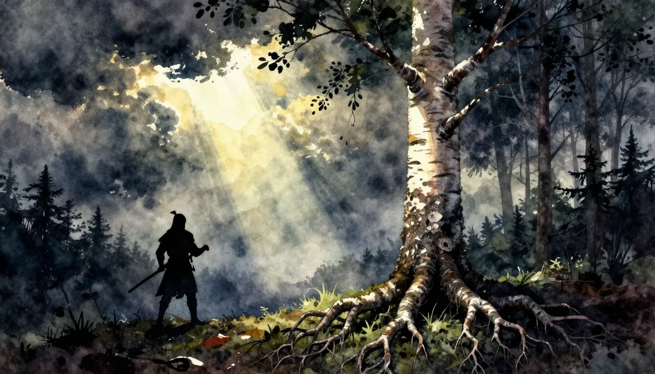 – Representações poderosas e icónicas de guerreiros em silhueta contra um fundo dramático e inspirador.