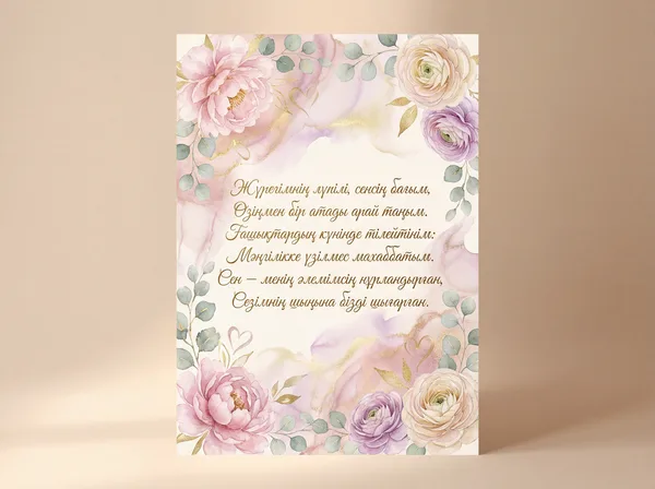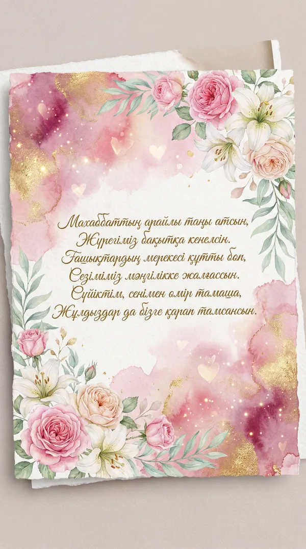 Жүрегімнің лүпілі, бағым сенсің, Өмірімнің арайлы таңы сенсің. Ғашықтардың мерекесі құтты болсын, Сен бар жерде бақытым мәңгі дерсің.