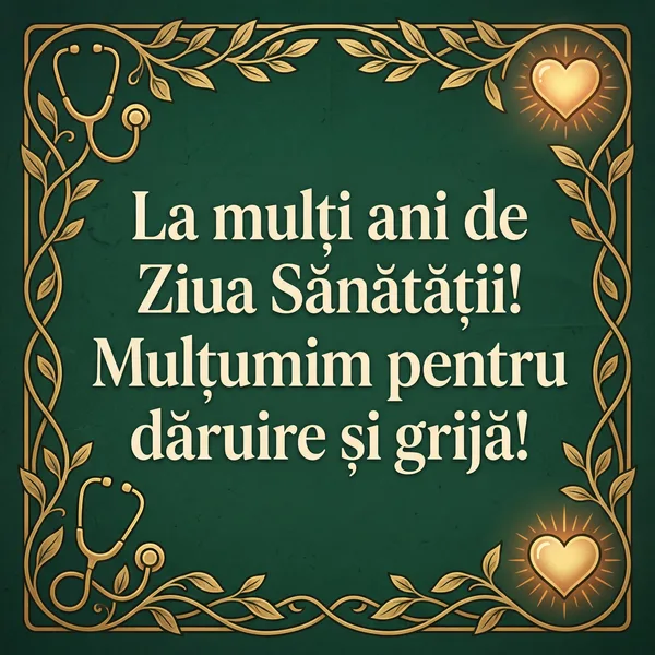 Arată-ți aprecierea pentru munca incredibilă pe care o depun medicii cu colecția noastră specială de felicitări! 👨⚕️👩⚕️ Găsește cuvintele perfecte pentru a le mulțumi pentru dăruirea, compasiunea și eforturile lor neobosite. Felicitările noastre sunt create pentru a transmite respect și recunoștință acestor eroi de zi cu zi care au grijă de sănătatea noastră. Un simplu mesaj de mulțumire poate aduce multă bucurie celor care își dedică viața salvării altora. Alege o felicitare din selecția noastră și onorează efortul medicilor cu un gând bun.