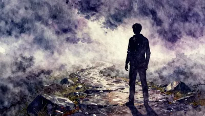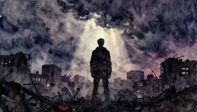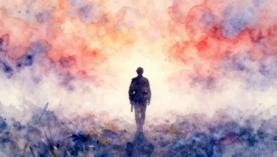 – Artă care prezintă o figură solitară conturată pe un fundal luminos și plin de contrast.