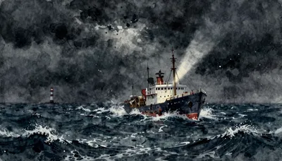 – Înfățișează o mică barcă de pescuit luptând cu o furtună violentă pe mare, simbolizând reziliența și perseverența neclintită.