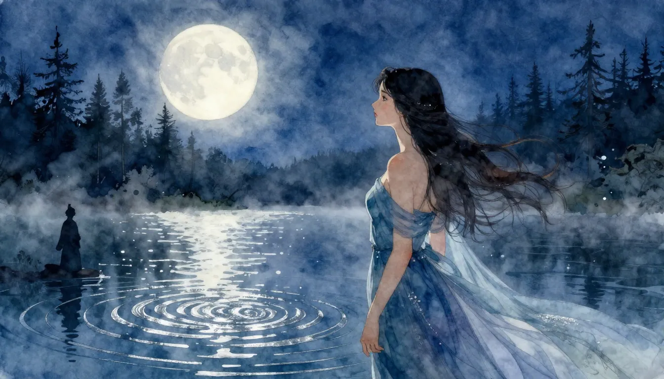 – O scenă de lac senină iluminată de lună, creând reflexii frumoase și mistice pe suprafața apei.