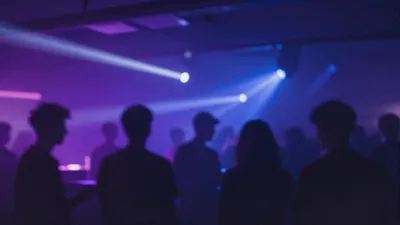 – Loc energic de muzică electronică, cu dans și lumini vibrante.