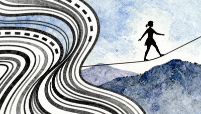 – Artă care înfățișează echilibriști pe sârmă, simbolizând echilibrul, riscul și provocările vieții