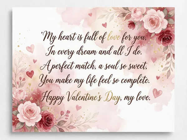 My heart is full because of you, In everything you say and do. A love so bright, a soul so kind, The greatest joy that I could find. Happy Valentine's Day, my dear, I'm glad to have you always near.