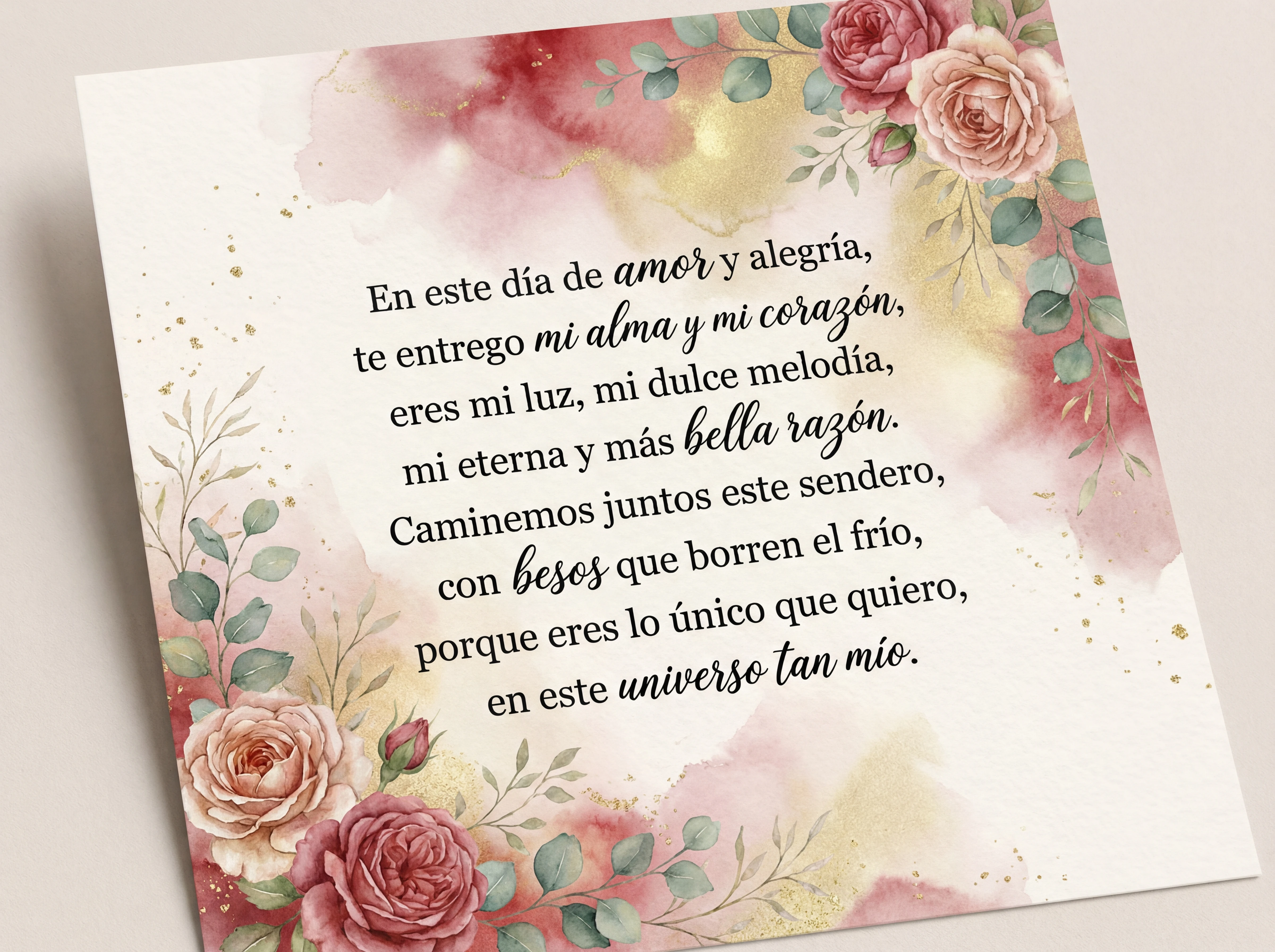 En este día de amor y alegría, te entrego mi alma y mi corazón, eres mi luz, mi dulce melodía, mi eterna y más bella razón. Caminemos juntos este sendero, con besos que borren el frío, porque eres lo único que quiero, en este universo tan mío.