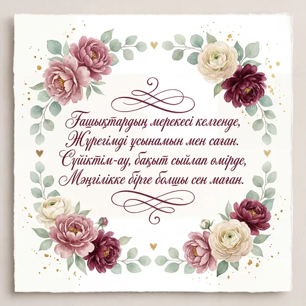 Ғашықтардың мейрамы құтты болсын, Жүрегіміз бақытқа нық толсын. Махаббатымыз мәңгілік алау болып, Өміріміз әрқашан гүлге толсын.