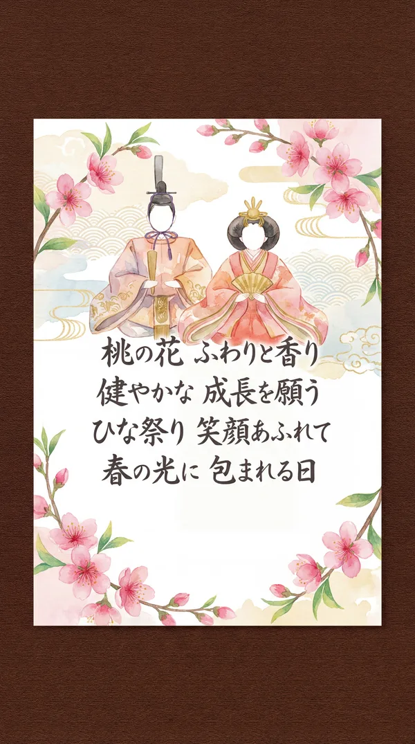 桃の花咲く 春の日に 健やかな成長 願いを込めて 雛人形が 見守る中で 笑顔あふれる 幸せな日々を