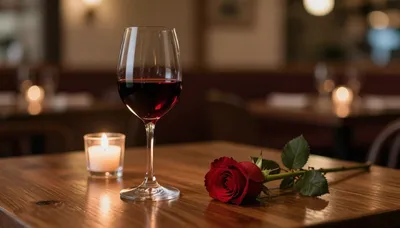– Уютная трапеза для двоих с вином, свечами и цветами, создающая неповторимую атмосферу для особенного момента.