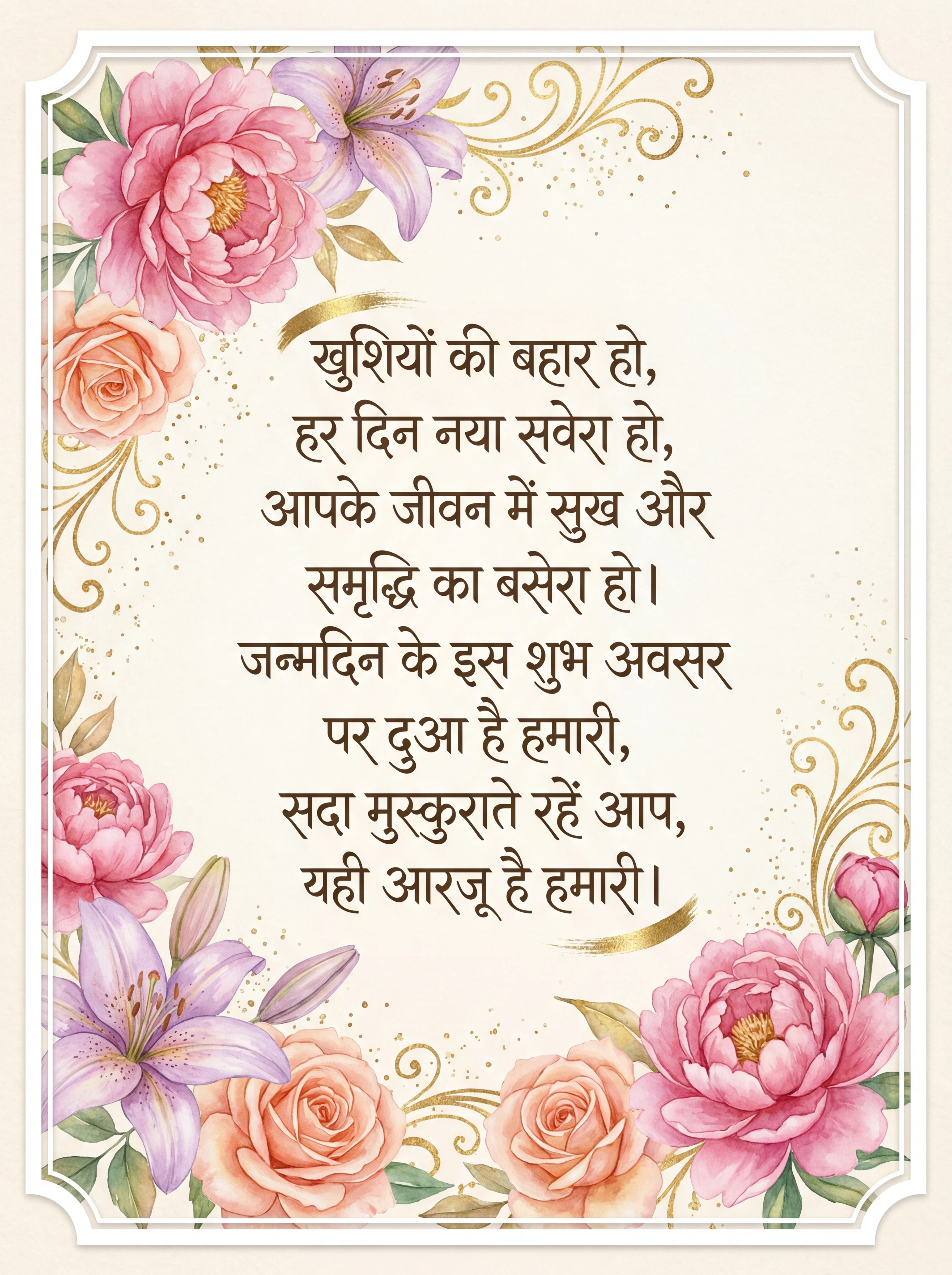 खुशियों की बहार हो, हर दिन नया सवेरा हो, आपके जीवन में सुख और समृद्धि का बसेरा हो। जन्मदिन के इस शुभ अवसर पर दुआ है हमारी, सदा मुस्कुराते रहें आप, यही आरज़ू है हमारी।