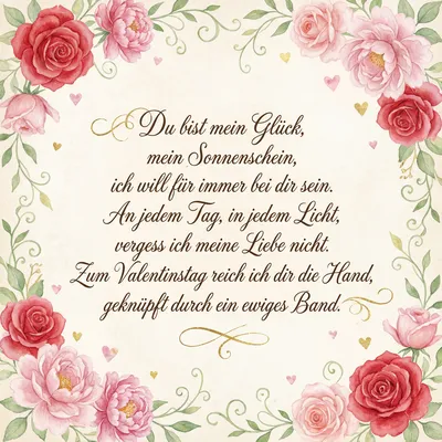 Du bist mein Glück, mein Sonnenschein, ich möchte immer bei dir sein. An jedem Tag, zu jeder Zeit, ist Liebe unsre Zweisamkeit. Zum Valentinstag wünsch ich dir, das größte Glück der Welt mit mir.