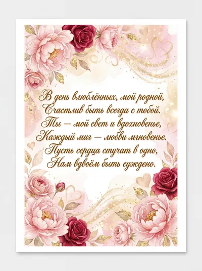 В день влюбленных, самый нежный, Я дарю тебе тепло. Океан любви безбрежной, Чтобы нам всегда везло. Ты — мой свет и вдохновение, Рядом быть — большая честь. Счастья каждое мгновение, Просто знай, что ты мой есть.