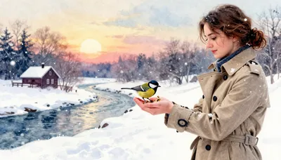 – Нежное и трогательное взаимодействие человека, кормящего маленькую дикую птицу, запечатленное в прекрасных произведениях искусства.