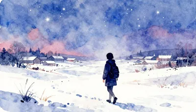 – Одинокое странствие по заснеженным пейзажам под звездным небом, наполненное чувством светлой меланхолии и тишины.