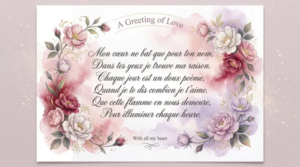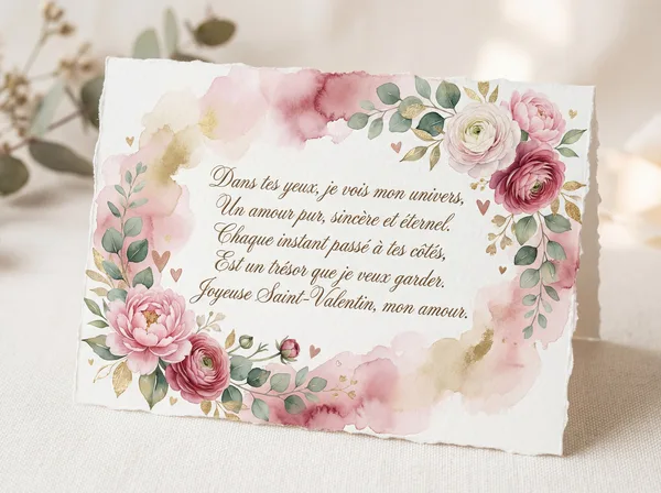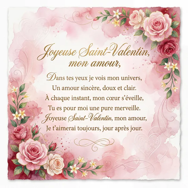 Mon cœur s'éveille à ton sourire, Dans tes yeux, je vois mon avenir. Un amour pur, une douce flamme, Qui réchauffe chaque jour mon âme. Joyeuse Saint-Valentin, mon amour.