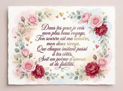 Dans tes yeux, je vois mon bonheur, Chaque instant avec toi est une fleur. Mon cœur bat au rythme du tien, Main dans la main vers notre destin. Joyeuse Saint-Valentin, mon amour, Je t'aimerai pour toujours.