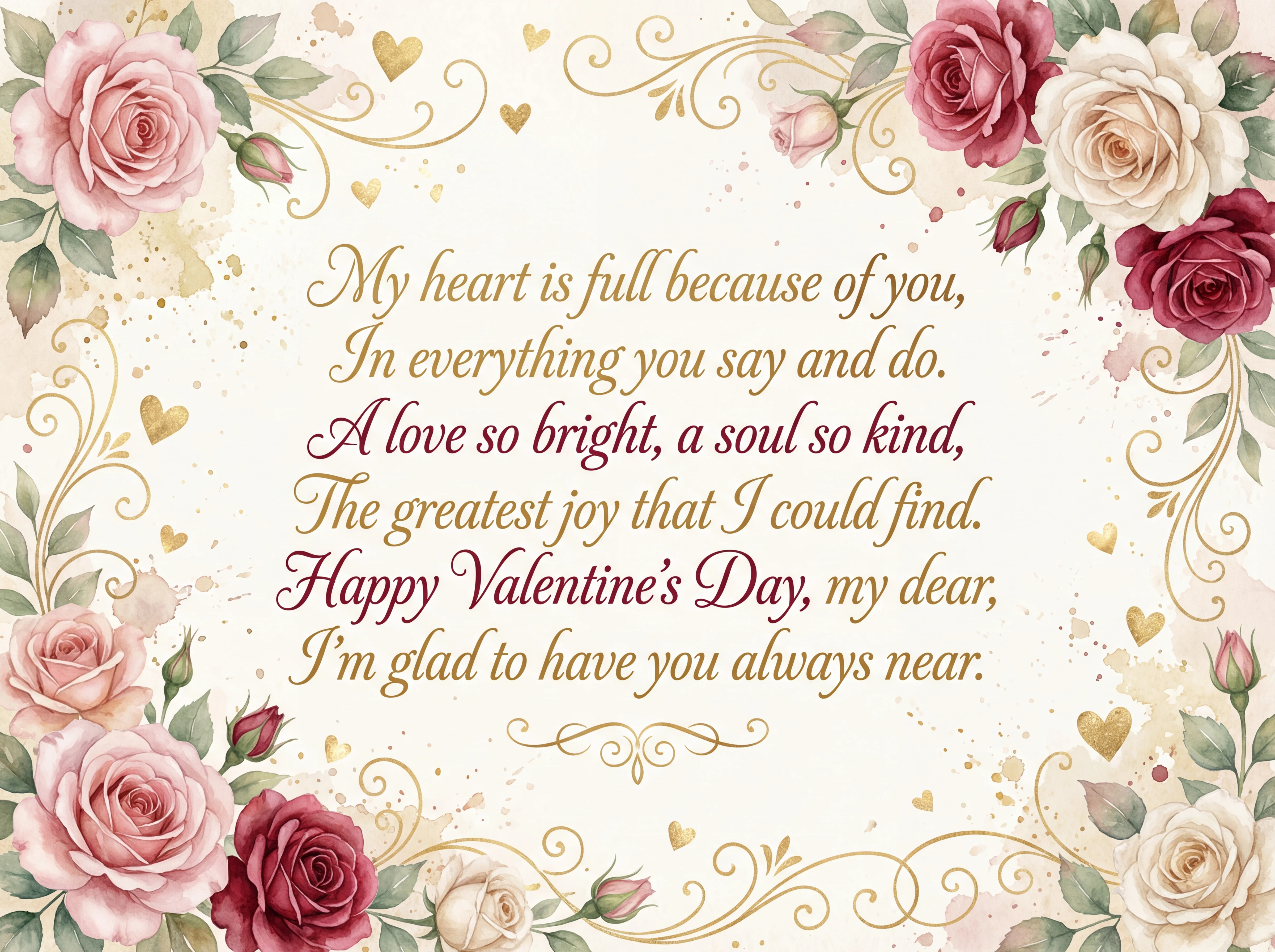 My heart is full because of you, In everything you say and do. A love so bright, a soul so kind, The greatest joy that I could find. Happy Valentine's Day, my dear, I'm glad to have you always near.