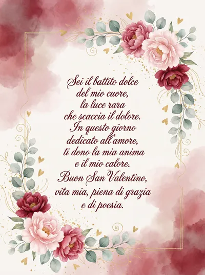 Sei la luce che illumina ogni mio giorno, Il porto sicuro dove sempre ritorno. In questo giorno di dolce passione, Sei tu del mio cuore l'unica ragione. Buon San Valentino, amore mio.