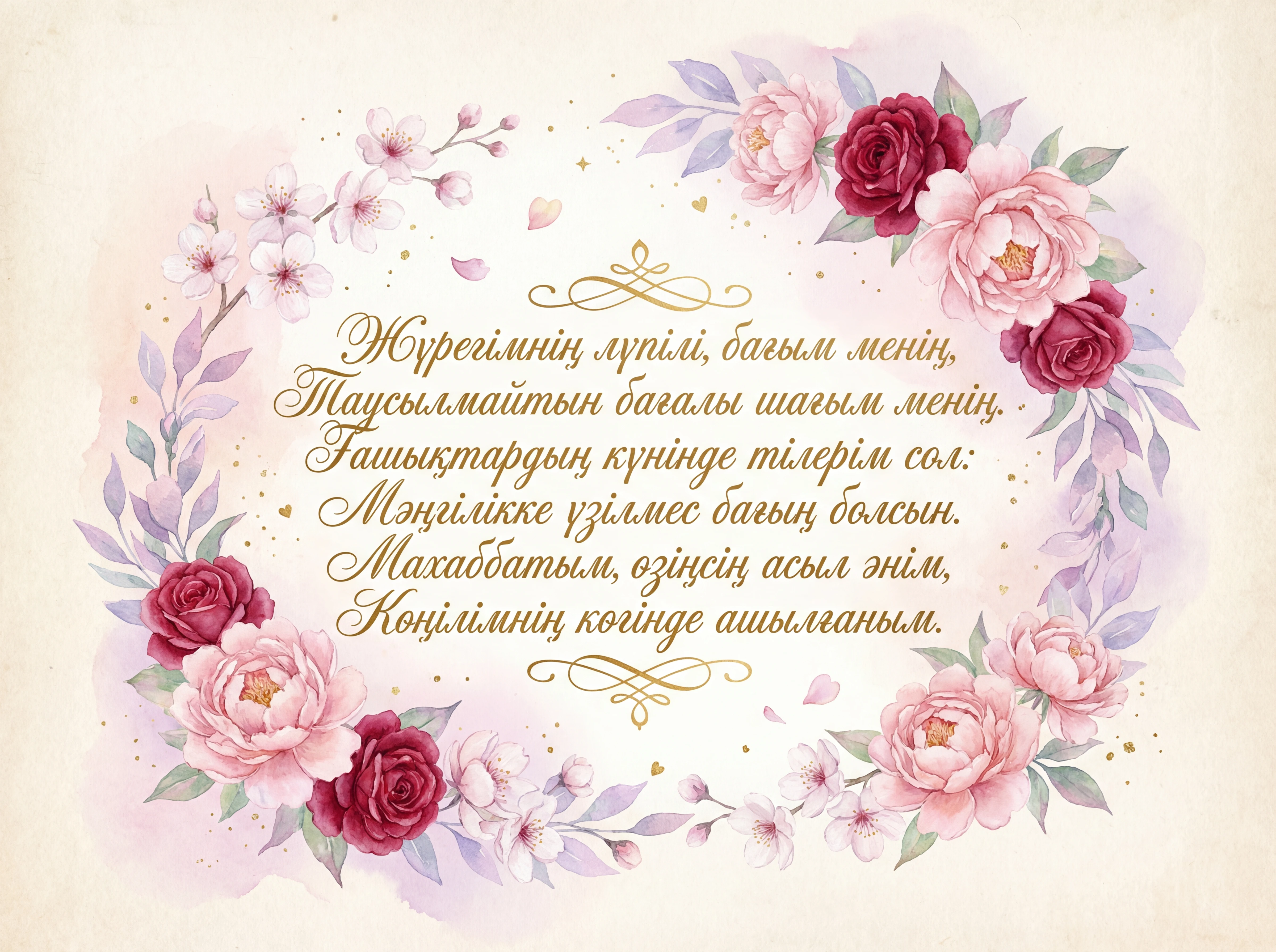 Жүрегімнің лүпілі, бағым менің, Таусылмайтын бағалы шағым менің. Ғашықтардың күнінде тілерім сол: Мәңгілікке үзілмес бағың болсын. Махаббатым, өзіңсің асыл әнім, Көңілімнің көгінде ашылғаным.
