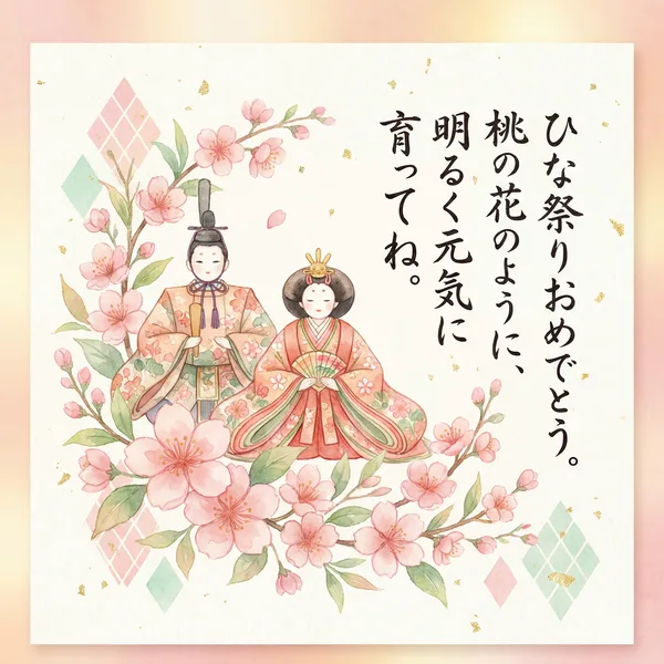桃の花 優しく揺れて 健やかな 成長を願う ひな祭りの 幸せな一日 あなたの笑顔が 輝きますように