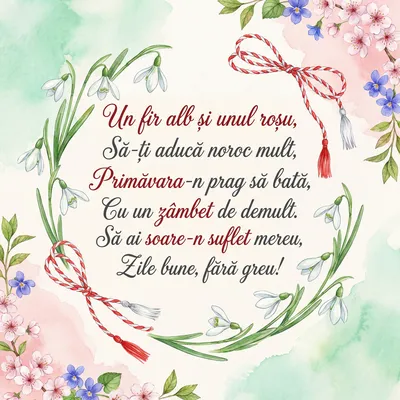 Un mărțișor plin de lumină, Să-ți facă viața mai senină, Cu flori de primăvară-n prag, Îți dăruiesc cu mult drag. Să porți în suflet soare mereu, Și zâmbetul să fie al tău, O prietenie ce-nflorește, Și primăvara o vestește.