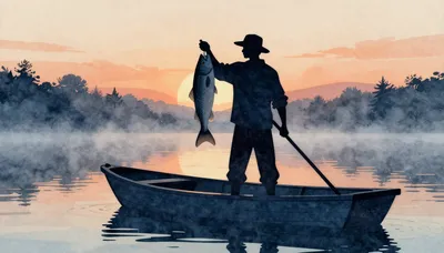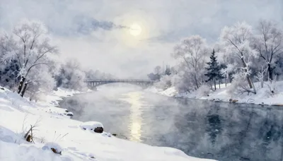 – En flodscen dold av tjock dimma, vilket skapar en eterisk och mystisk atmosfär.