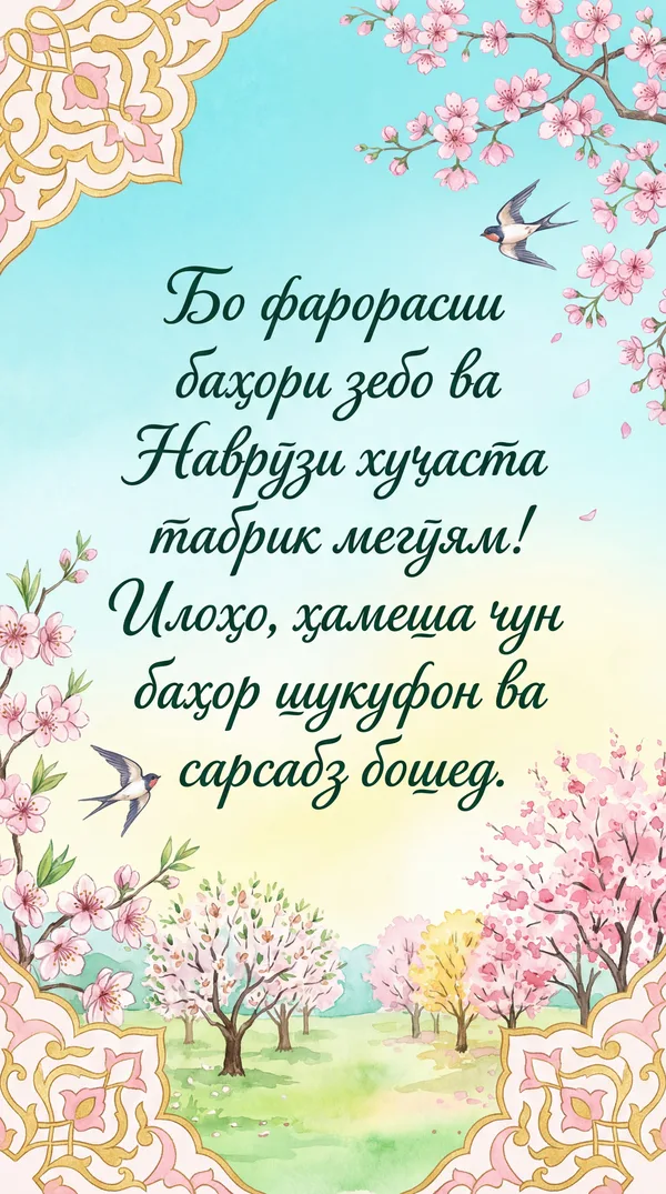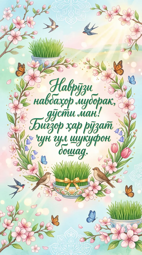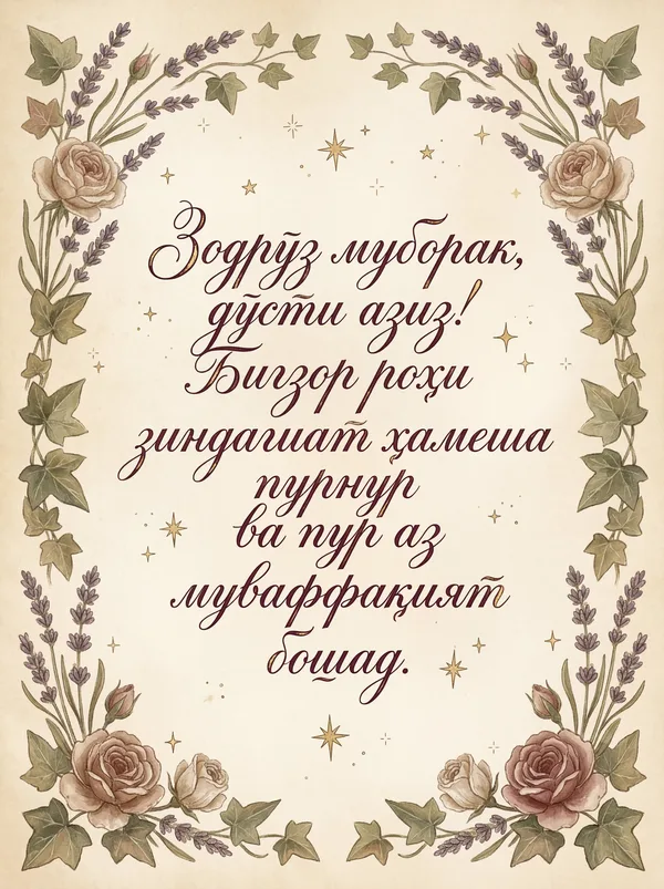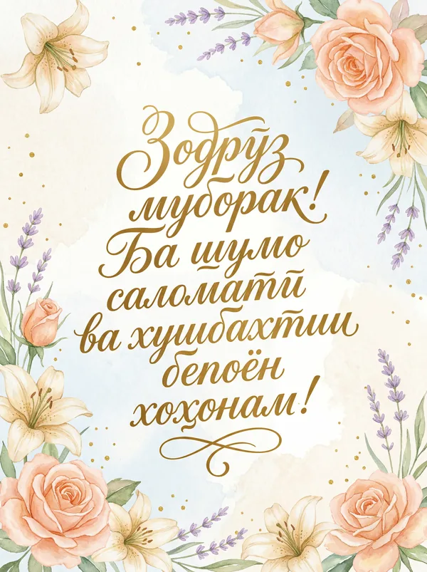 Кортҳои табрикотии зебои аз ҷониби нейросеть тарҳрезишуда барои ҳар як муносибат. Боргирӣ кунед, чоп кунед ё ба таври рақамӣ мубодила кунед — ҳамааш ройгон! Рӯзи касеро бе сарфи ягон тин махсус гардонед. 💌