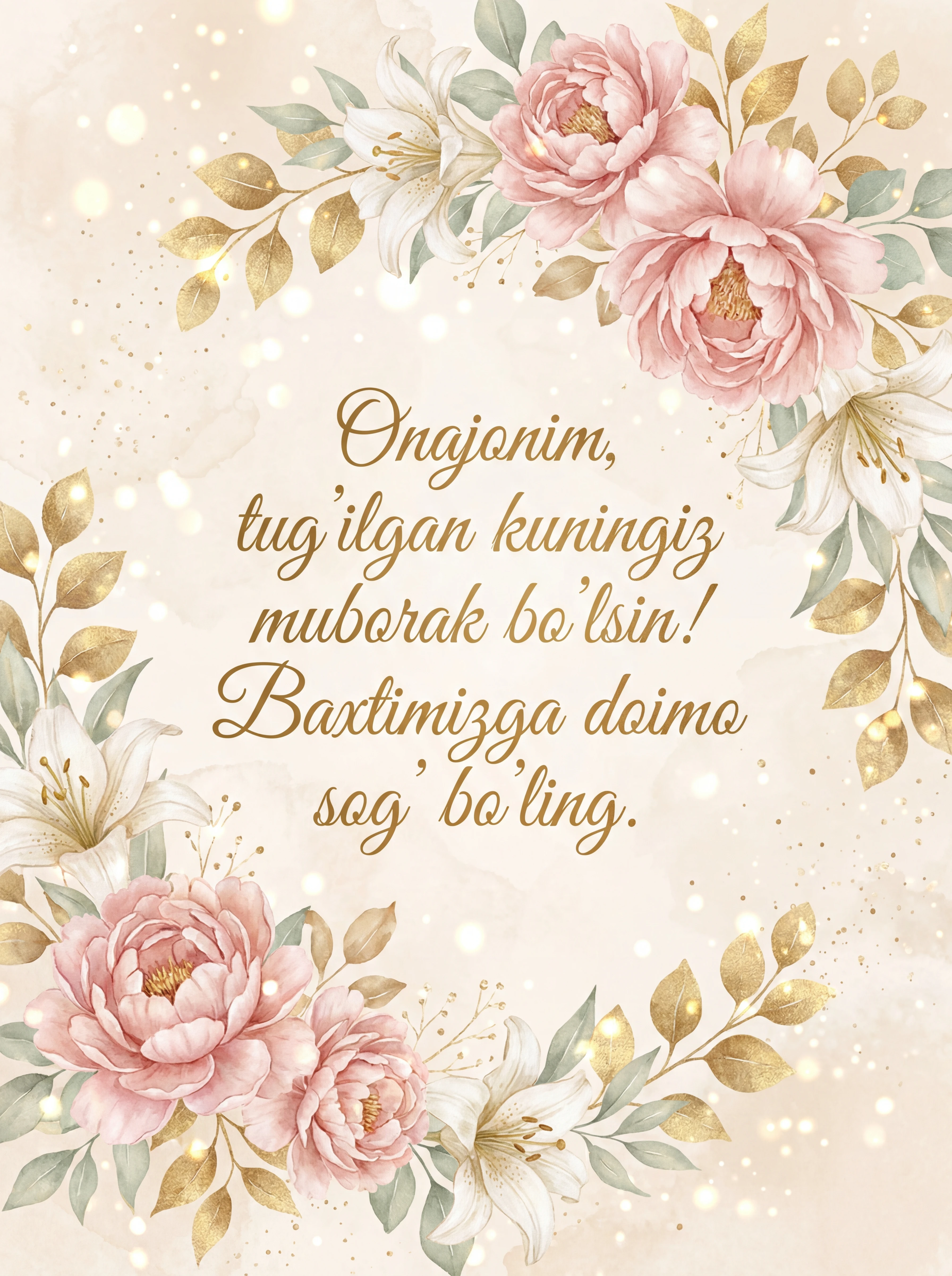 Onajonim, tug'ilgan kuningiz muborak bo'lsin! Baxtimizga doimo sog' bo'ling.