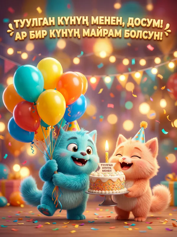 Туулган күнүң менен, досум! Ден соолугуң бекем болсун, Ар бир күнүң бакытка толсун!
