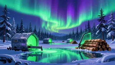 – ภาพประกอบของทุ่งทุนดราที่ปกคลุมด้วยหิมะอันกว้างใหญ่ พร้อมแสงเหนือและดาวเหนือ