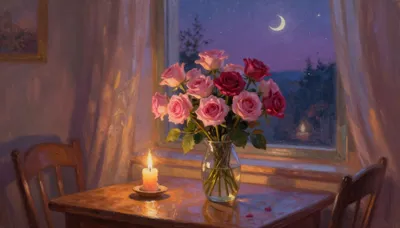 – รูปภาพช่อดอกกุหลาบในแจกันพร้อมแสงไฟอ่อนๆ