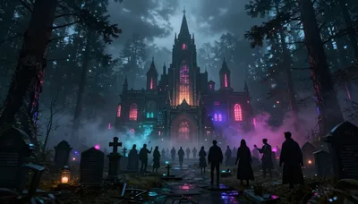 – Sining na nagpapakita ng madilim at misteryosong eksena sa kagubatan na may mga nakatagong elemento.