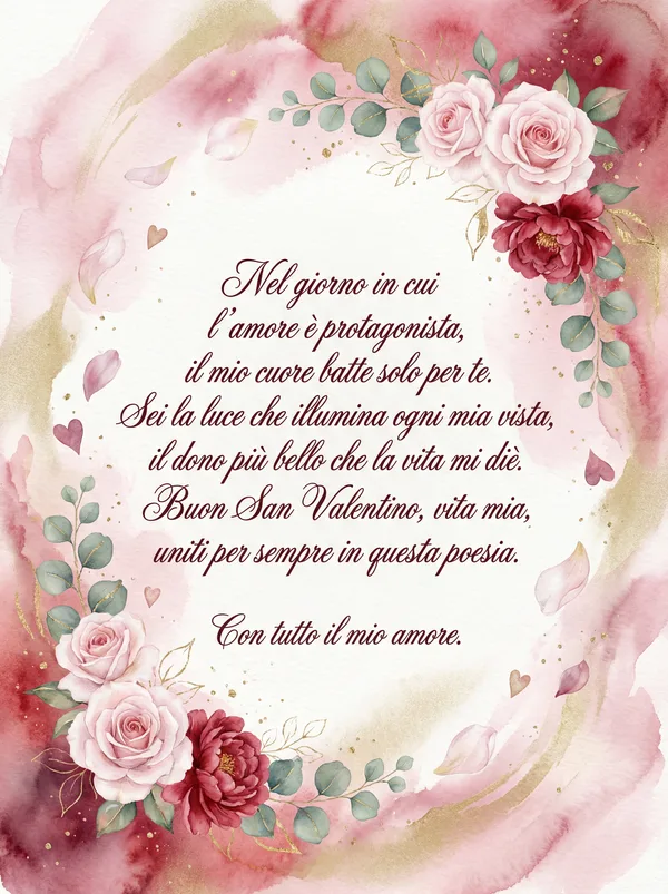 Sei il sole che scalda ogni mio mattino, Il sogno più bello che porto vicino. In questo giorno di dolce passione, Ti dono il mio cuore e questa canzone. Buon San Valentino, amore mio.