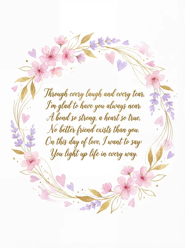 A bond of gold, a heart so true, I'm grateful for a friend like you. Through every laugh and every day, You brighten up the world in every way. Happy Valentine's Day!