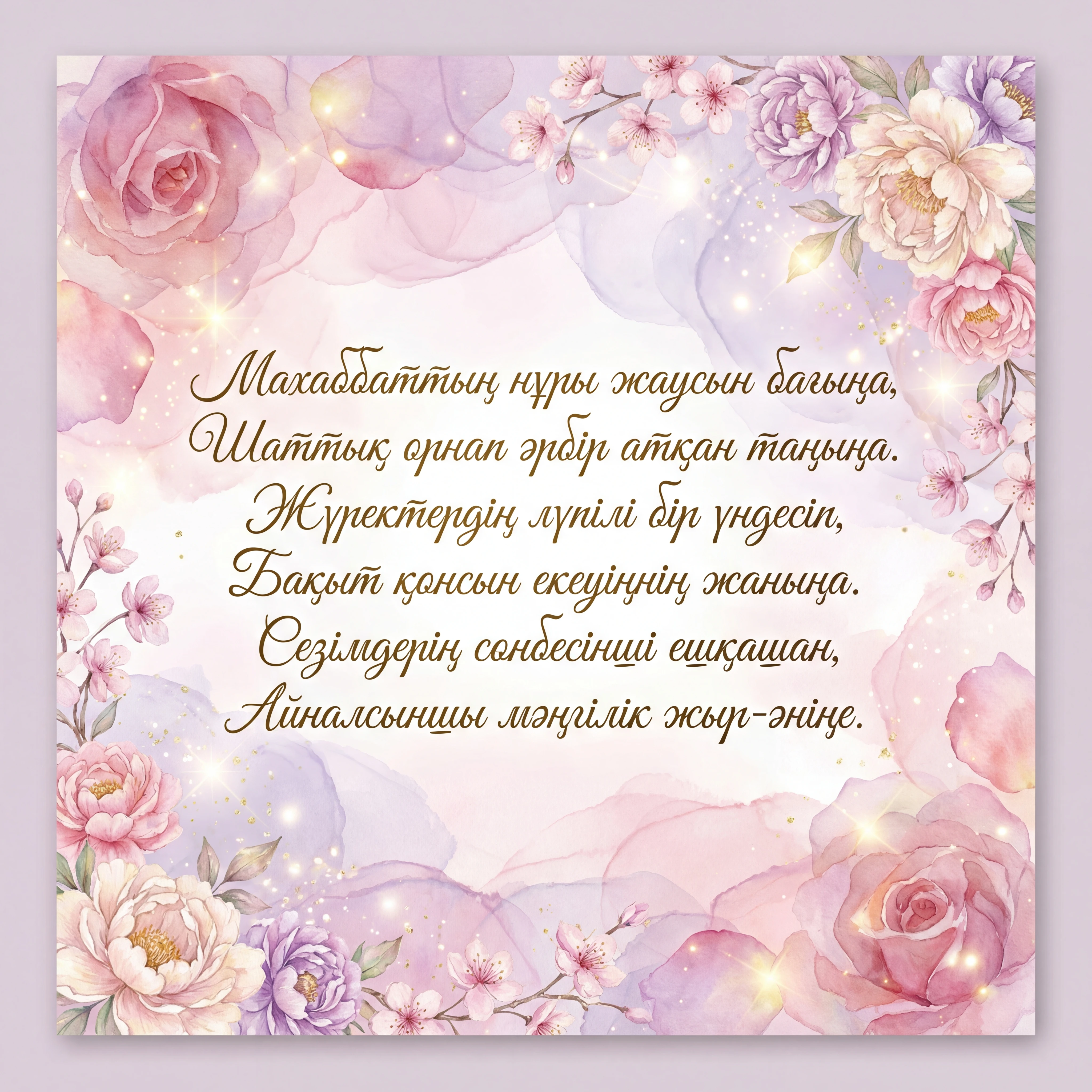 Жүрегімнің лүпілі, сенің атың, Өзіңсің ең аяулы махаббатым. Ғашықтар мерекесі құтты болсын, Сенсің менің бақытым, асыл бағым.