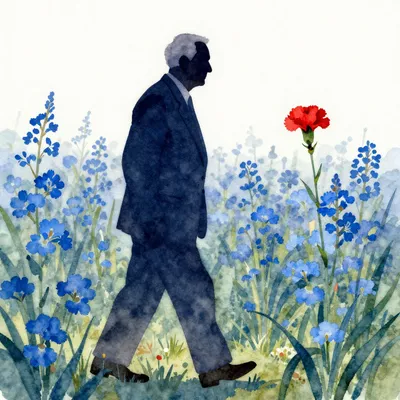 – Bir tarlada kırmızı karanfile doğru yürüyen takım elbiseli yaşlı bir adamın silueti.